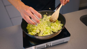 7. Over a medium heat melt 20g butter. Add the leeks, garlic, salt and pepper, and cook for 5 minutes until soft, ensuring the leeks dry out as much as possible in the pan. Then take off the heat and set aside.